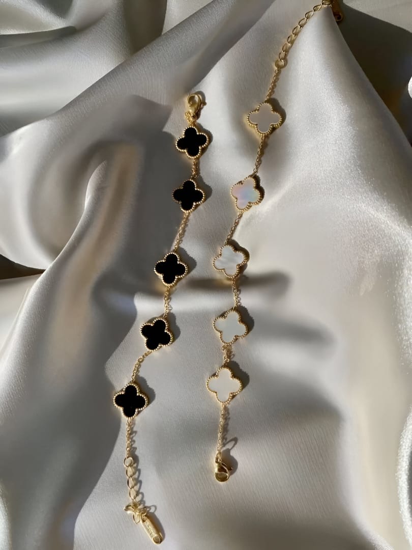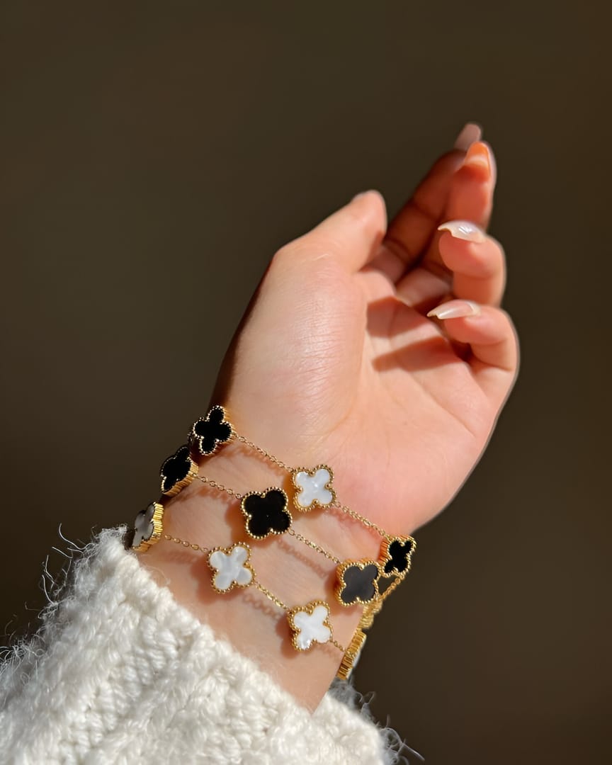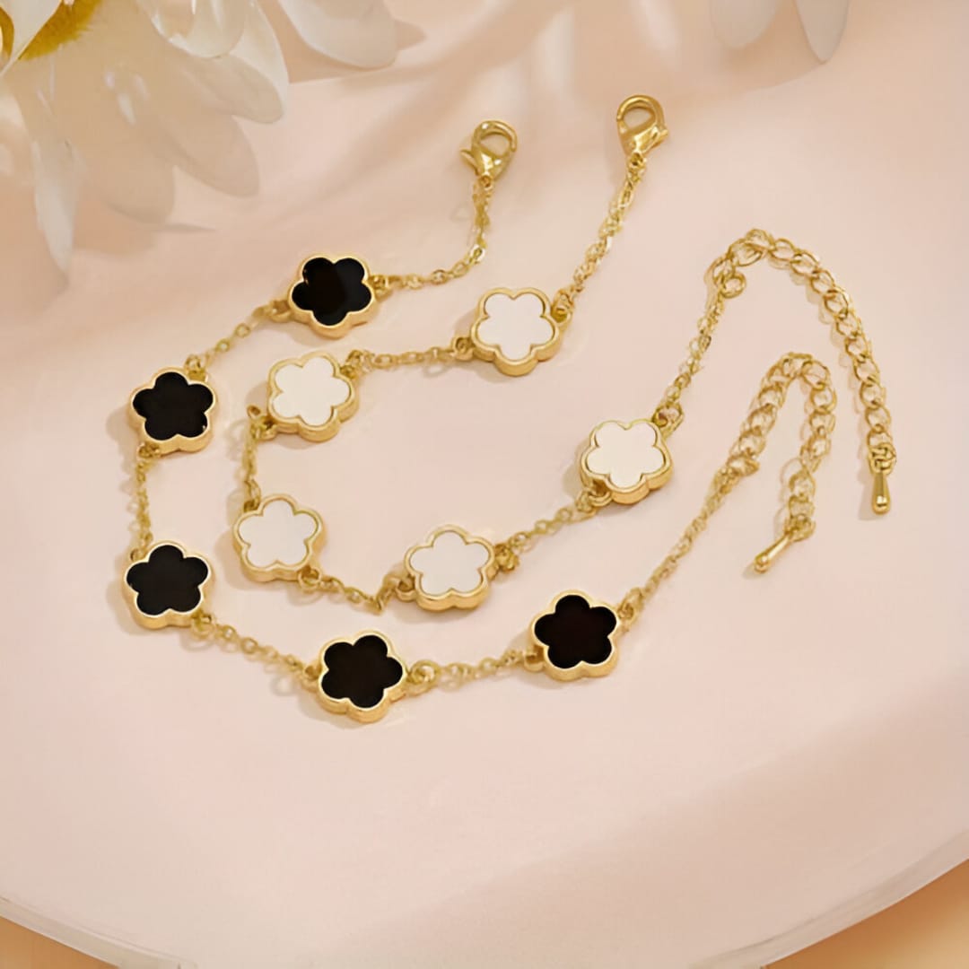 A timeless pair of anti-tarnish bracelets in sleek black and elegant white, designed to complement any look. This classic duo symbolizes balance and style, making it perfect for both everyday wear and special occasions.