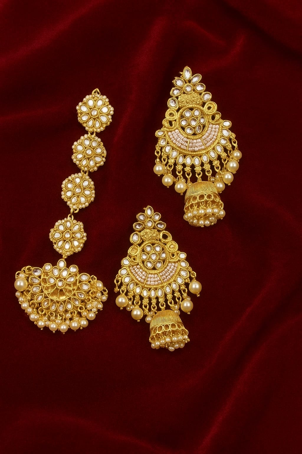 A regal jewelry set featuring intricately designed kundan earrings paired with a matching maang tikka and a special head patti. Embellished with lustrous pearls and shimmering white stones, the set exudes elegance and traditional charm. Perfect for weddings, festive occasions, and bridal wear, it adds a statement touch to any ethnic outfit.